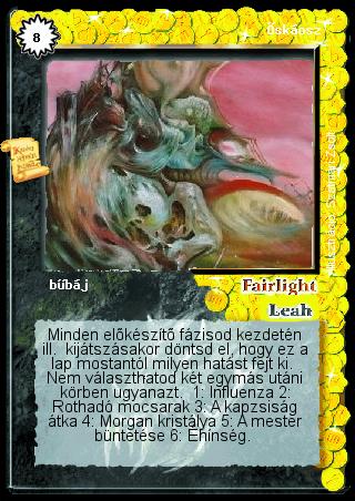 Szöveg: Minden előkészítő fázisod kezdetén ill. kijátszásakor döntsd el, hogy ez a lap mostantól milyen hatást fejt ki. Nem választhatod két egymás utáni körben ugyanazt. 1: Influenza 2: Rothadó mocsarak 3: A kapzsiság átka 4: Morgan kristálya 5: A mester büntetése 6: Éhínség.