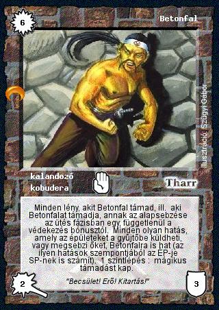 Kiadás: Chara-din visszatér Gyakoriság: ritka Lapszín (isten): Tharr Típus: kalandozó Altípus: kobudera Szöveg: Minden lény, akit Betonfal támad, ill. aki Betonfalat támadja, annak az alapsebzése az ütés fázisban egy, függetlenül a védekezés bónusztól. Minden olyan hatás, amely az épületeket a gyűjtőbe küldheti, vagy megsebzi őket, Betonfalra is hat (az ilyen hatások szempontjából az ÉP-je SP-nek is számít). 1 szintlépés: mágikus támadást kap. Szinesítő szöveg: "Becsület! Erő! Kitartás!" Illusztráció: