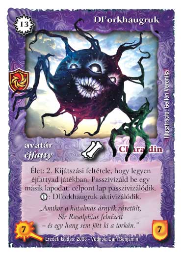 Kiadás: Ősi legendák, Alappakli, 8. kiadás, Védnök 2023 Gyakoriság: ritka Lapszín (isten): Chara-din Típus: avatár Altípus: éjfatty Szöveg: Élet: 2. Kijátszási feltétele, hogy legyen éjfattyad játékban. Passzivizáld be egy másik lapodat: célpont lap passzivizálódik. 1 VP: Dl'orkhaugruk aktivizálódik. Szinesítő szöveg: "Amikor a hatalmas árnyék rávetült, Sir Rasolphius felnézett - és egy hang sem jött ki a torkán." Illusztráció: Váradi János
