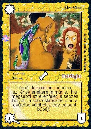 Kiadás: Létsíkok Gyakoriság: ritka Lapszín (isten): Fairlight Típus: szörny Altípus: féreg Szöveg: Repül, láthatatlan, bűbájra, szirének énekére immúnis. Ha megsebzi az ellenfelet, a sebzés helyett, a sebzéskiosztás után a gyűjtőbe küldhetsz egy célpont bűbájt. Illusztráció: Fischer Tamás