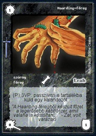 Kiadás: Hőskorszak Gyakoriság: gyakori Lapszín (isten): Leah Típus: szörny Altípus: féreg Szöveg: (P),3VP: passzívan a tartalékba küld egy kalandozót. Szinesítő szöveg: "A Haarding-féregből készült főzet a legerősebb kábítószer, amit valaha is kóstoltam..." - Zat, volt varázsló Illusztráció: Bőjthe Csaba