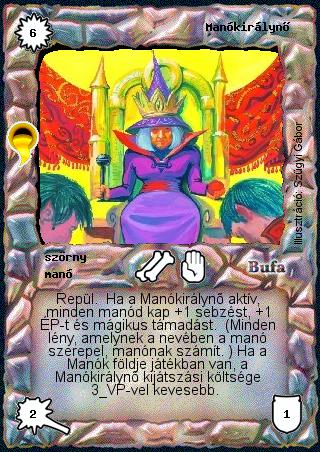 Szöveg: Repül. Ha a Manókirálynő aktív, minden manód kap +1 sebzést, +1 ÉP-t és mágikus támadást. (Minden lény, amelynek a nevében a manó szerepel, manónak számít. ) Ha a Manók földje játékban van, a Manókirálynő kijátszási költsége 3 VP-vel kevesebb.