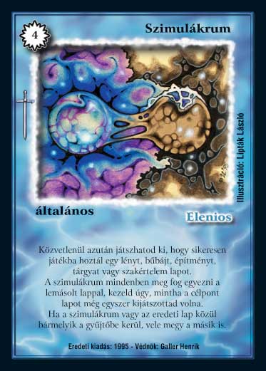 Kiadás: Hőskorszak, Védnök 2023 Gyakoriság: ritka Lapszín (isten): Elenios Típus: általános Szöveg: Közvetlenül azután játszhatod ki, hogy sikeresen játékba hoztál egy lényt, bűbájt, építményt, tárgyat vagy szakértelem lapot. A szimulákrum mindenben meg fog egyezni a lemásolt lappal, kezeld úgy, mintha a célpont lapot még egyszer kijátszottad volna. Ha a szimulákrum vagy az eredeti lap közül bármelyik a gyűjtőbe kerül, vele megy a másik is. Illusztráció: Lipták László