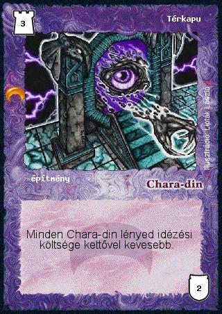 Kiadás: Chara-din visszatér Gyakoriság: gyakori Lapszín (isten): Chara-din Típus: építmény Szöveg: Minden Chara-din lényed idézési költsége kettővel kevesebb. Illusztráció: Lipták László
