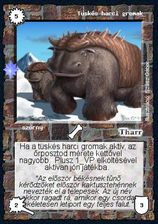 Kiadás: Ezüsthajnal Gyakoriság: nem gyakori Lapszín (isten): Tharr Típus: szörny Szöveg: Ha a tüskés harci gromak aktív, az őrposztod mérete kettővel nagyobb. Plusz 1 VP elköltésével aktívan jön játékba. Szinesítő szöveg: "Az először békésnek tűnő kérődzőket először kaktusztehénnek nevezték el a telepesek. Az új név akkor ragadt rá, amikor egy csorda tökéletesen letiport egy teljes falut." Illusztráció: Szász Gábor
