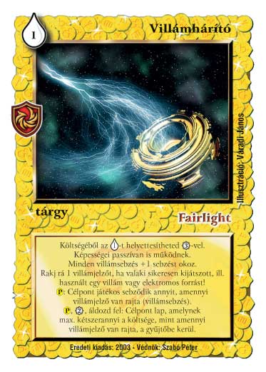 Kiadás: Ébredés, Védnök 2023 Gyakoriság: ritka Lapszín (isten): Fairlight Típus: tárgy Szöveg: Idézési költségéből az áldozást helyettesítheted 3 VP elköltésével. Képességei passzívan is működnek. Minden villámsebzés +1 sebzést okoz. Ha valaki sikeresen kijátszott, ill. használt egy villám vagy elektromos forrást, akkor rakj a villámhárítóra egy villámjelzőt. (P): Célpont játékos sebződik annyit, amennyi villámjelző van rajta (ez villámsebzés). (P), 2 VP, áldozd fel: Célpont lap, amelynek max. kétszerannyi az idézési költsége, mint amennyi villámjelző van rajta, a gyűjtőbe kerül. Illusztráció: Váradi János